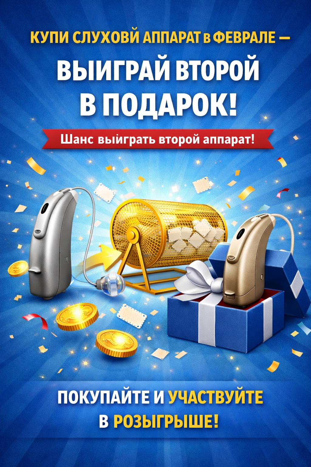Приобретая слуховой аппарат в феврале, вы автоматически становитесь участником розыгрыша второго слухового аппарата. Без дополнительных условий и скрытых требований. Просто покупка и реальный шанс получить второй аппарат в подарок.